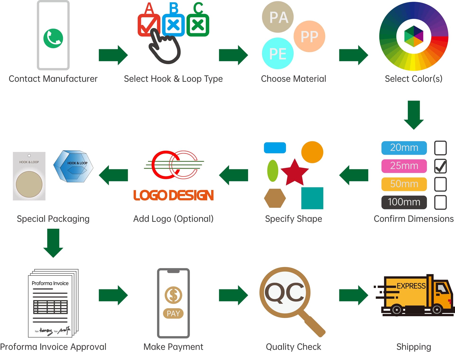 Nous vous remercions de l'intérêt que vous portez à nos produits auto-agrippants personnalisés. Afin de vous garantir une expérience claire et efficace, nous avons détaillé ci-dessous notre processus de commande standard. Ce processus transparent vous guidera du premier contact à la livraison finale.